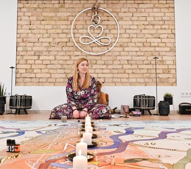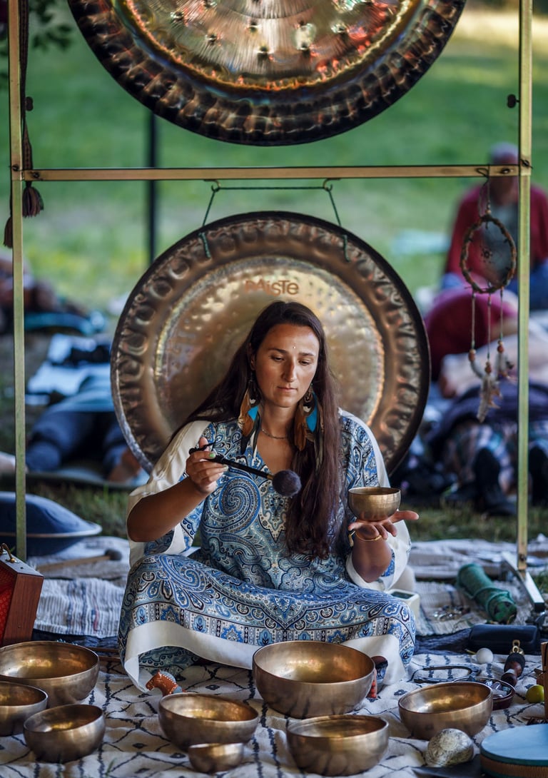 Garsų kelionė - tai turtinga giliais dažniais ir vibracijomis garso terapija, kurioje skamba gongai, būgnai, balsas, vėjo varpeliai, hangai, ramybę skleidžiantys Tibeto dubenys bei krištolo taurės.